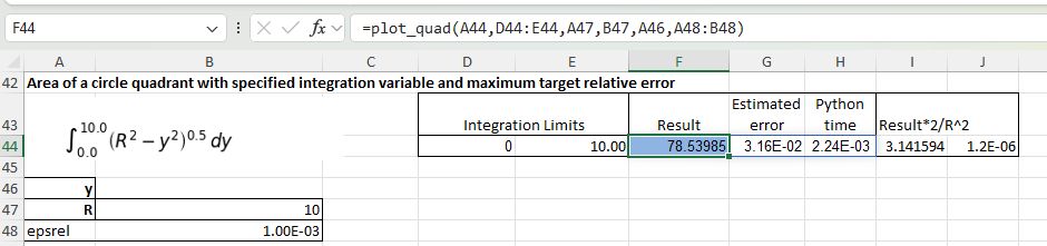 When the function is entered the result of the integration is returned in the function cell, and an image of the definite integral is displayed in Latex format immediately below. The image may be selected and dragged to any desired new location, as shown in the second example above. This example returns the area of a circle quadrant, which in this case is accurate to 15 significant figures.