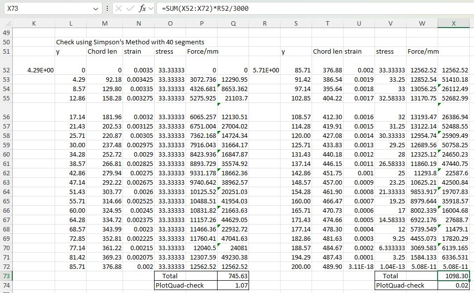The spreadsheet also has an on-sheet check using Simpson’s method with each block divided into 20 layers, showing good (but less exact) agreement: