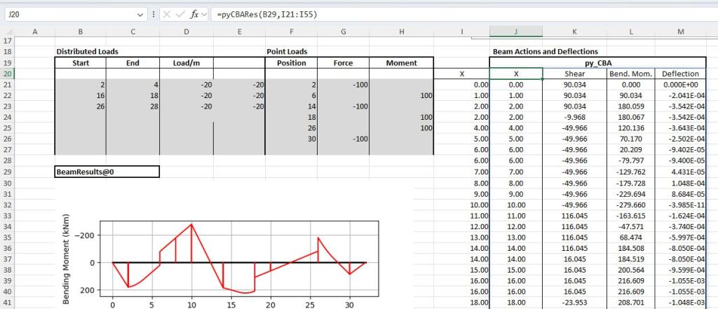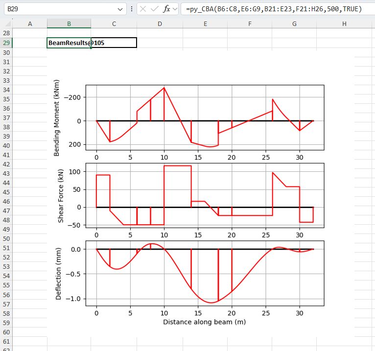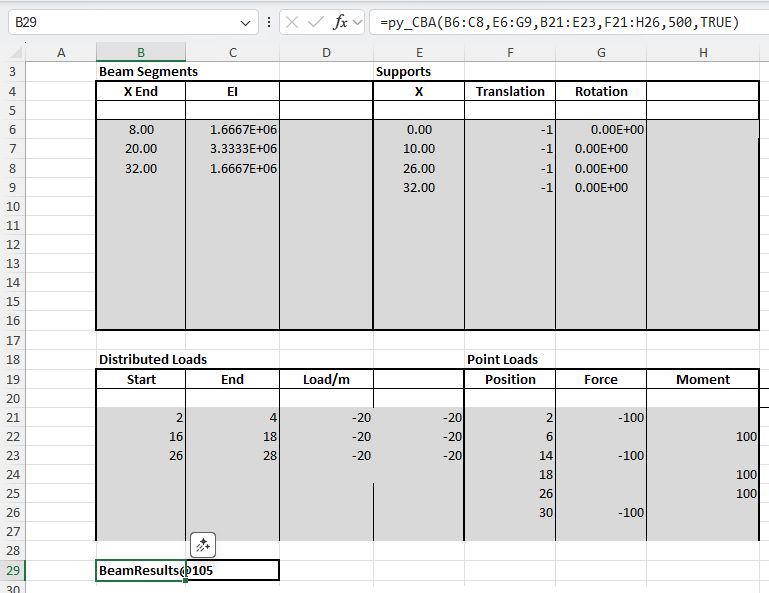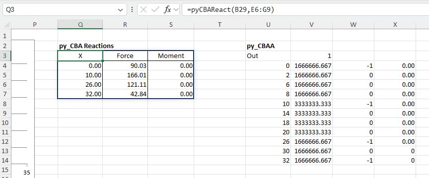 The bulk of the work is done by the new py_CBA function which converts the input data from py_Conbeam format, creates a BeamAnalysis object, and runs the analyze method. The resulting beam_results object is returned to Excel as a cache_object, from which other pxll based Excel functions can extract and display the required results values.