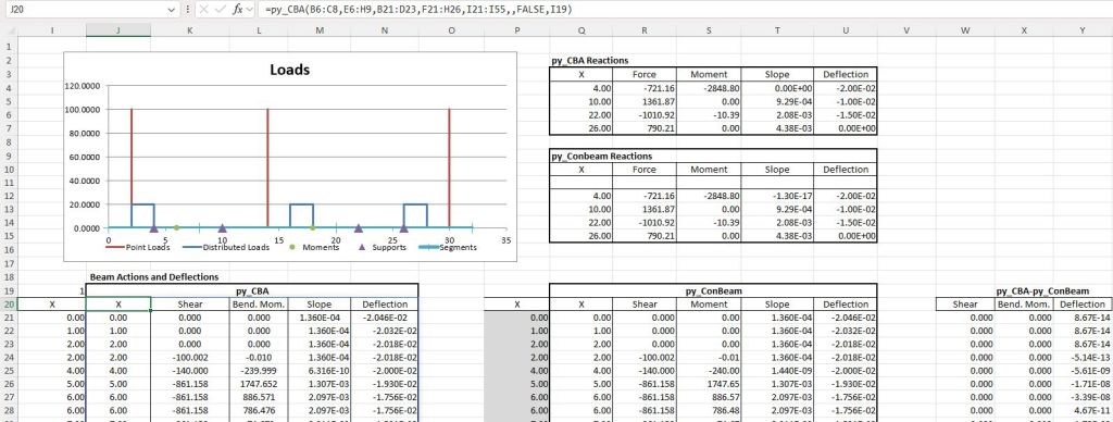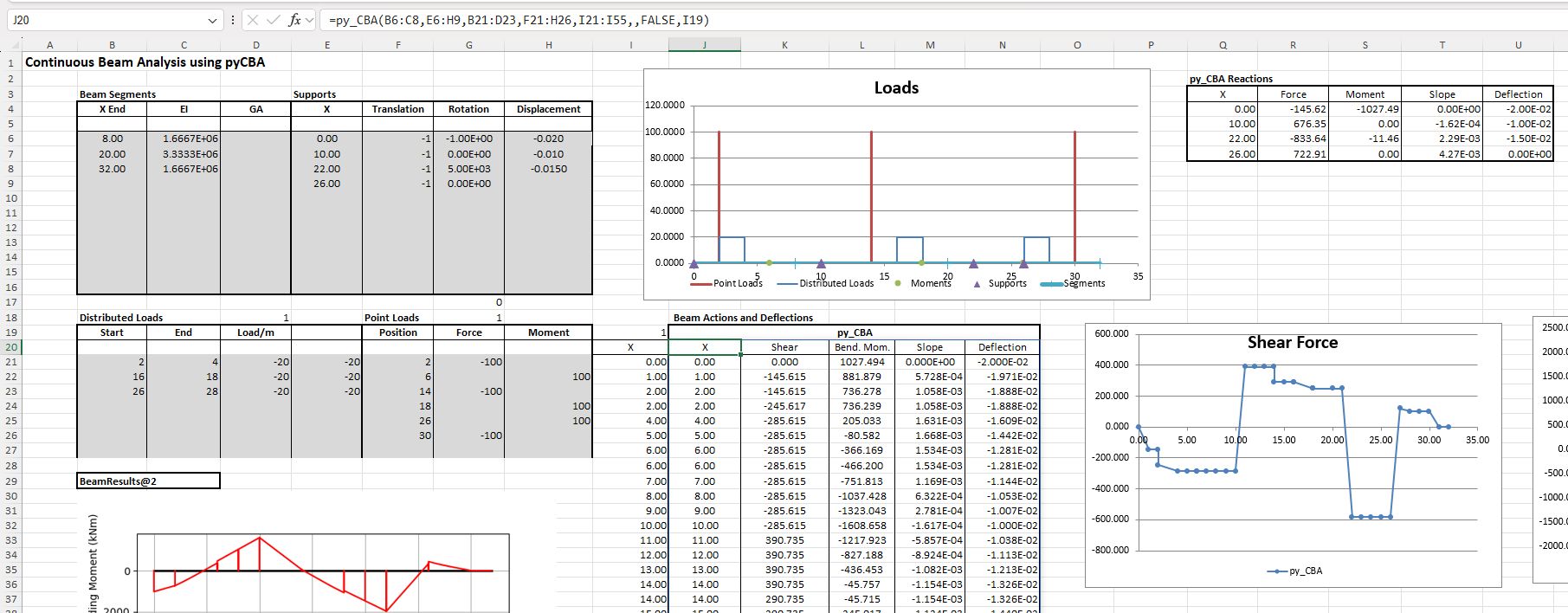 The results have also been compared against the py_Conbeam function on the py_CBA-Check v Conbeam-support def.xlsb spreadsheet, with near exact agreement. Results are shown below for a 3 spam beam with two cantilevers, and 3 supports with specified deflections: