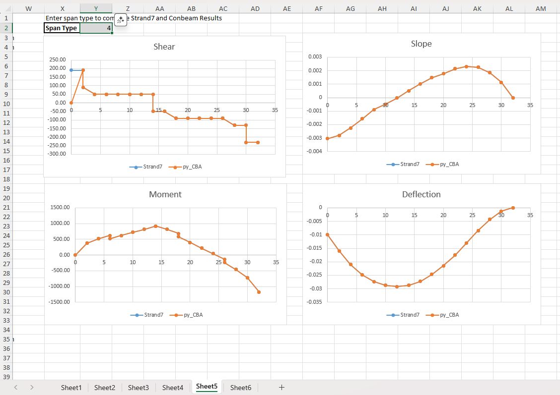As before, the latest functions have been checked against Strand7 analyses of 15 different span arrangements, each with 6 different support conditions. The py_CBA results were generated in the py_CBA-Check26-2.xlsb spreadsheet, and all results are compared with Strand7 in Check py_CBA-16Jan26.xlsb. The results for the different support conditions are copied to six different sheets, and the results for any span type can be displayed by entering the Span Type number in cell Y2. The results are very close, except that currently where a specified deflection analysis is carried out, and the first support is at X = 0, the shear force at that support is shown as zero, as shown below: