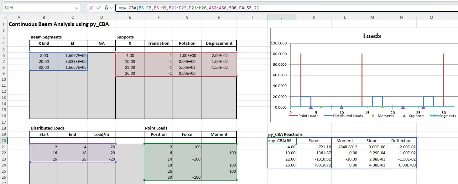 As stated in the previous post, this post will cover the calculation of beam actions and displacements when one or more supports have a defined vertical displacement, using the pyCBA beam analysis package. The Python code has been updated since the previous post, so the revised code and associated spreadsheets should be downloaded from: