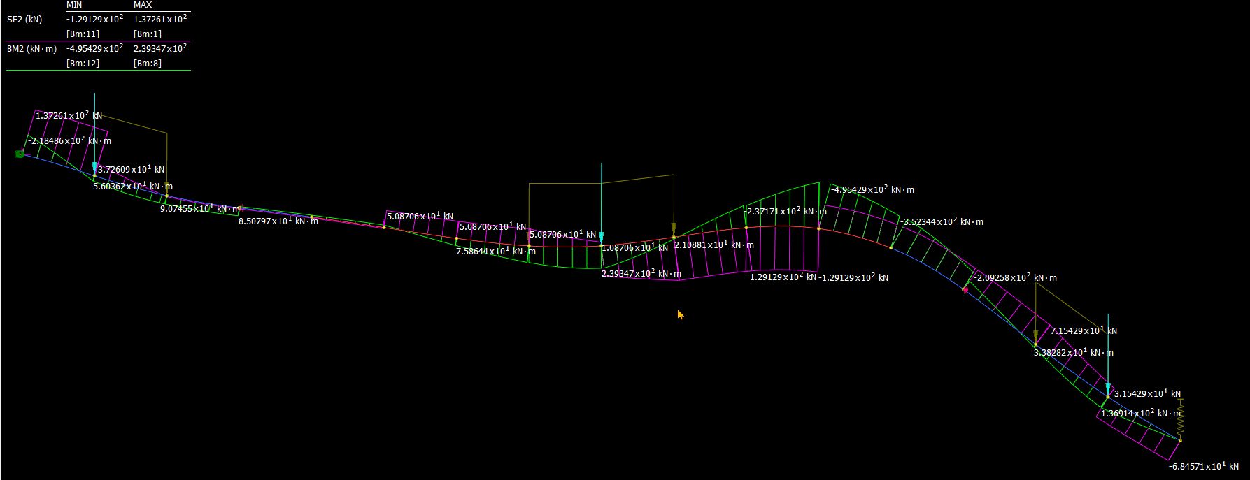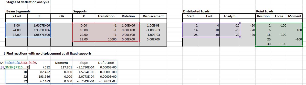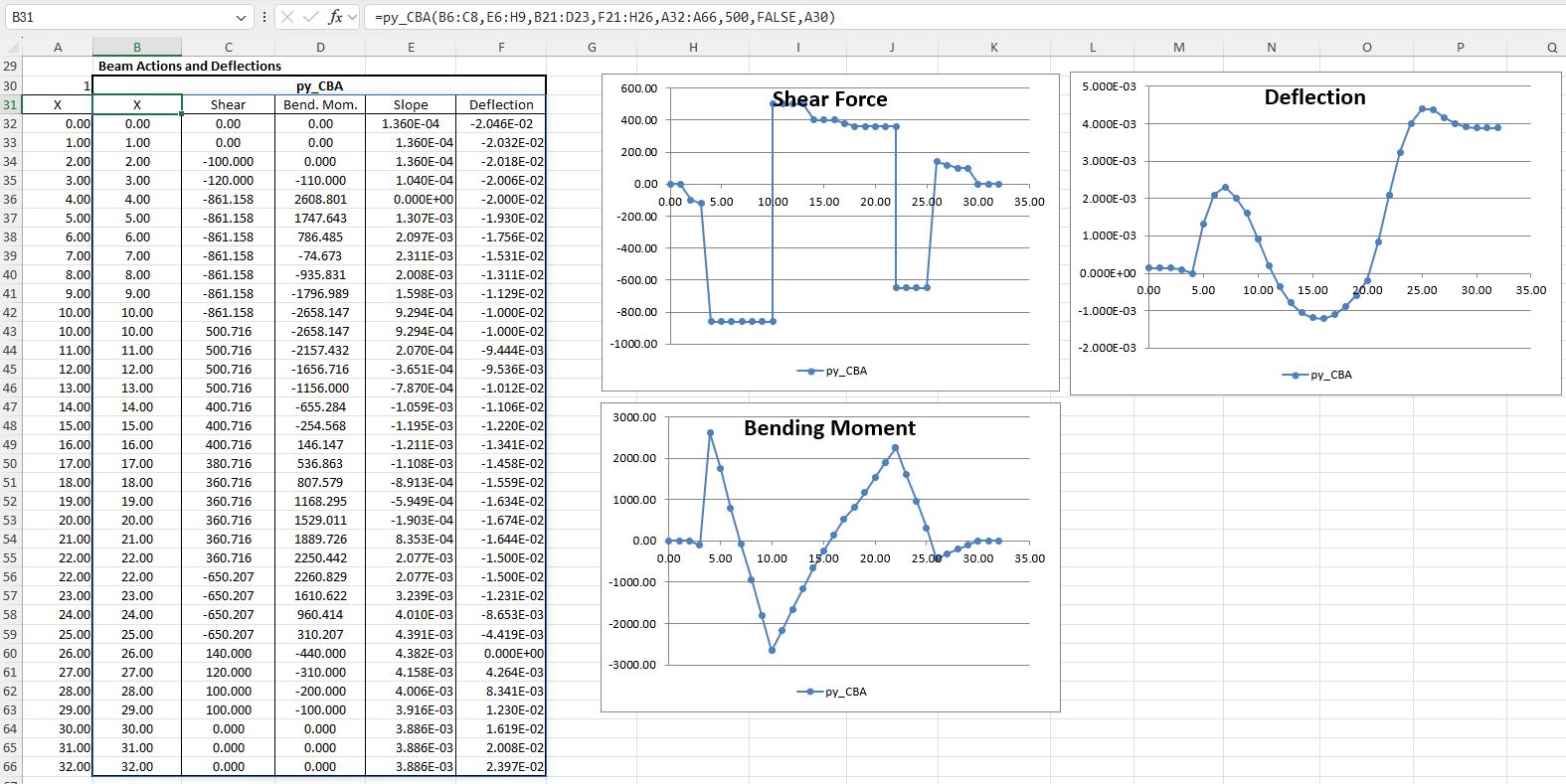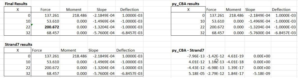 This procedure is shown step by step in the screenshots below and is included on the DefStages sheet of the py_CBA-def-stages.xlsb file. The final results are compared with the results of a Strand7 analysis, with near exact agreement.