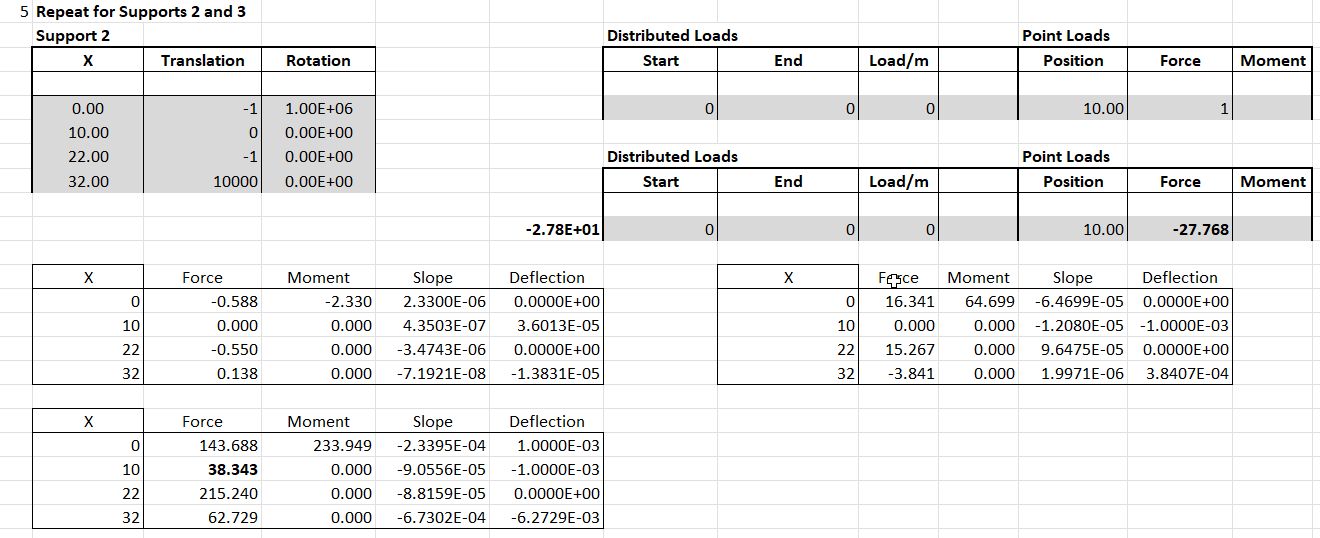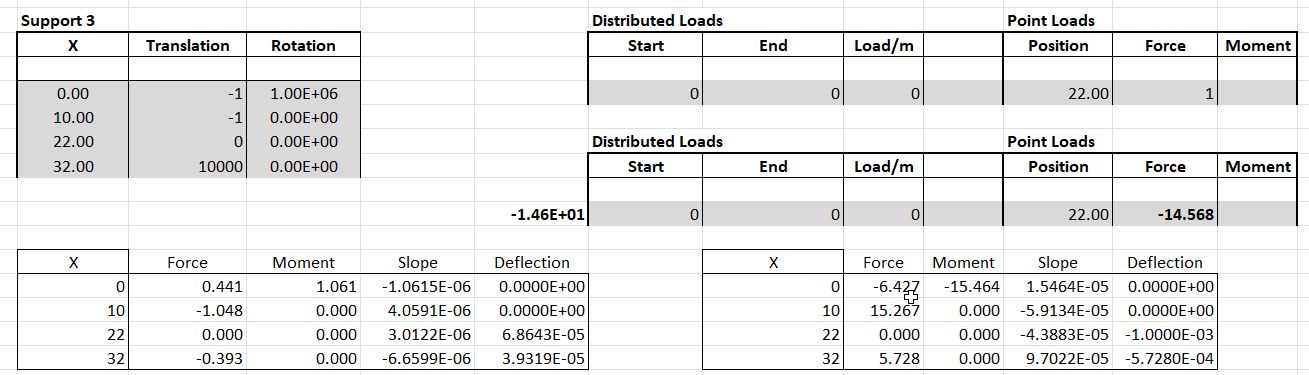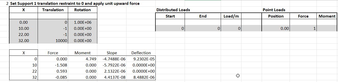 At the first fixed support, set translation restraint to zero, and apply unit upward force: