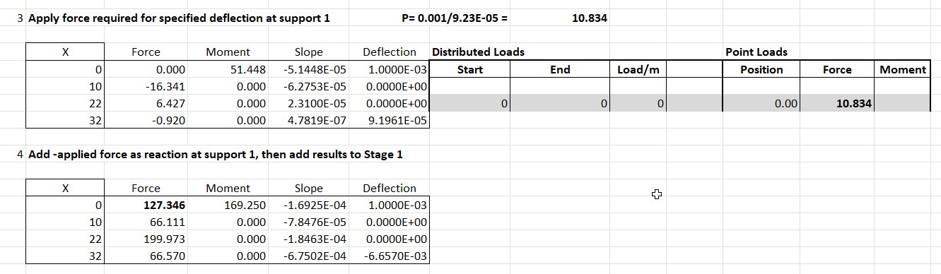 Specified displacement/displacement due to unit force - Apply this force at the support, and add the resulting actions and displacements to the results from the first stage.