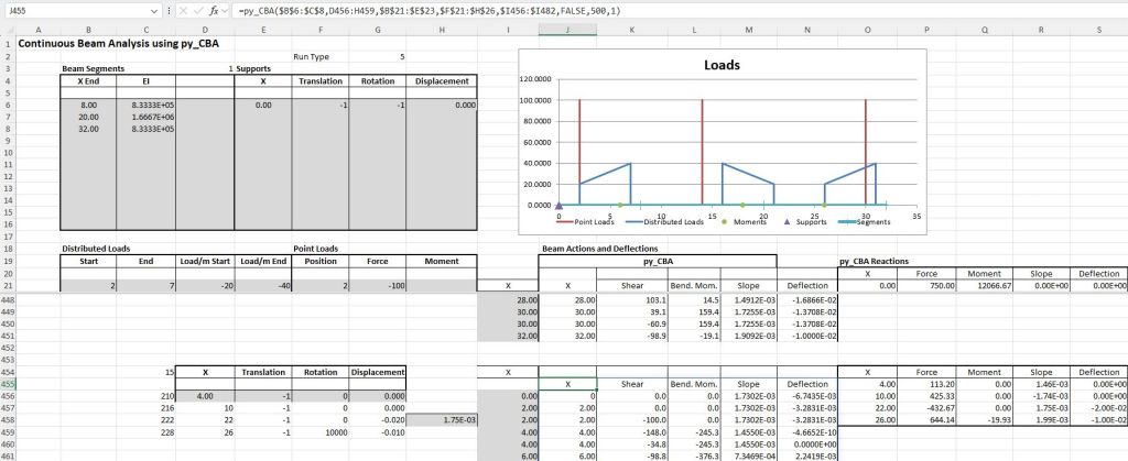 The latest version of the Python continuous beam analysis program pyCBA is 0.7, allowing for specification of trapezoidal distributed loads, and this is now available with pip. I have updated the py-xlCBA spreadsheet and associated code to use the latest version, and the revised files can be downloaded from: