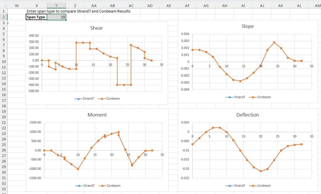 This file can be viewed without access to Python or any of the associated packages. Enter 1-15 in the “Span Type” cell (Y2) to view results from Strand7 and pyCBA on any of the 6 worksheets.