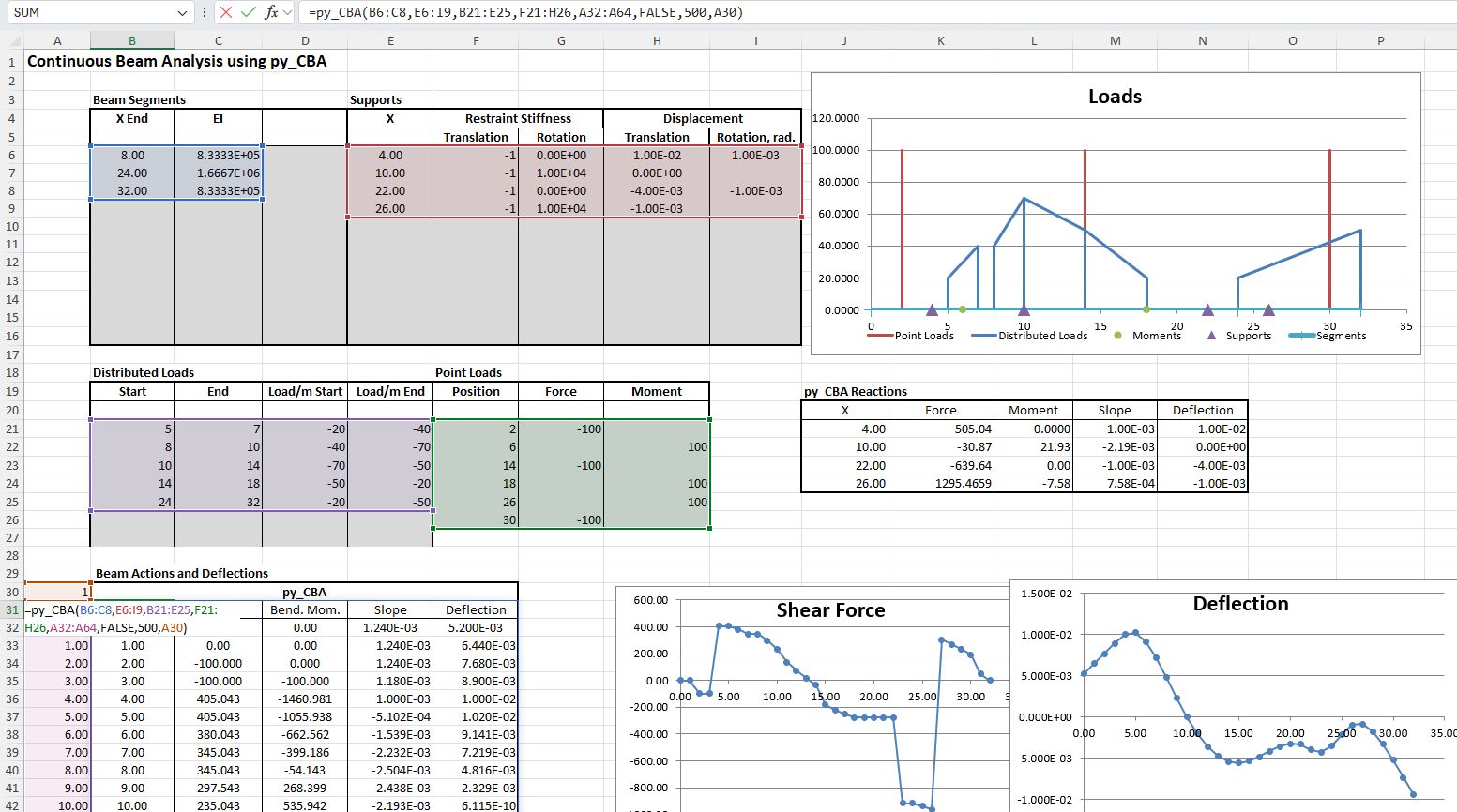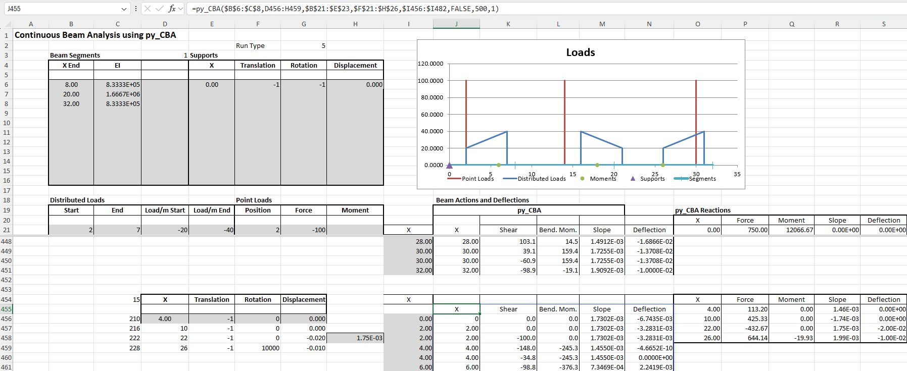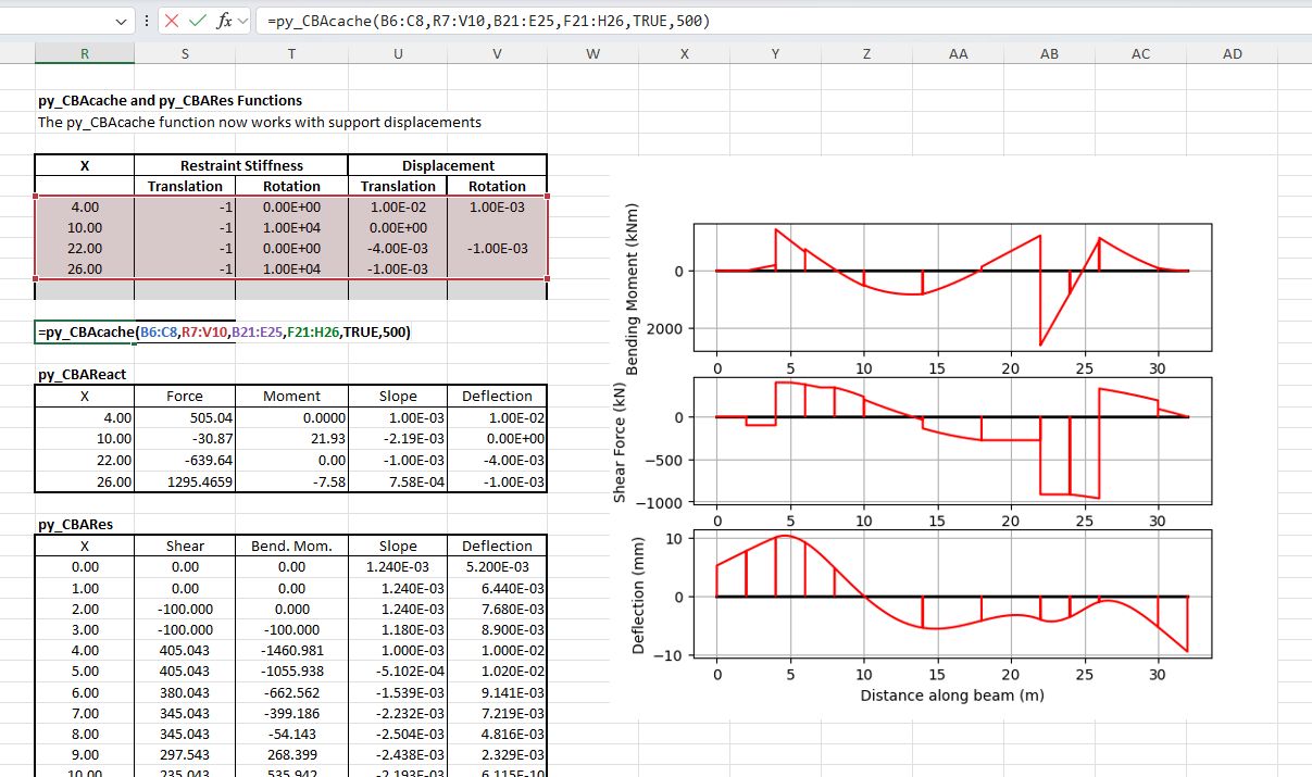 The latest version of the Python continuous beam analysis program pyCBA is 0.7, allowing for specification of trapezoidal distributed loads, and this is now available with pip. I have updated the py-xlCBA spreadsheet and associated code to use the latest version, and the revised files can be downloaded from: